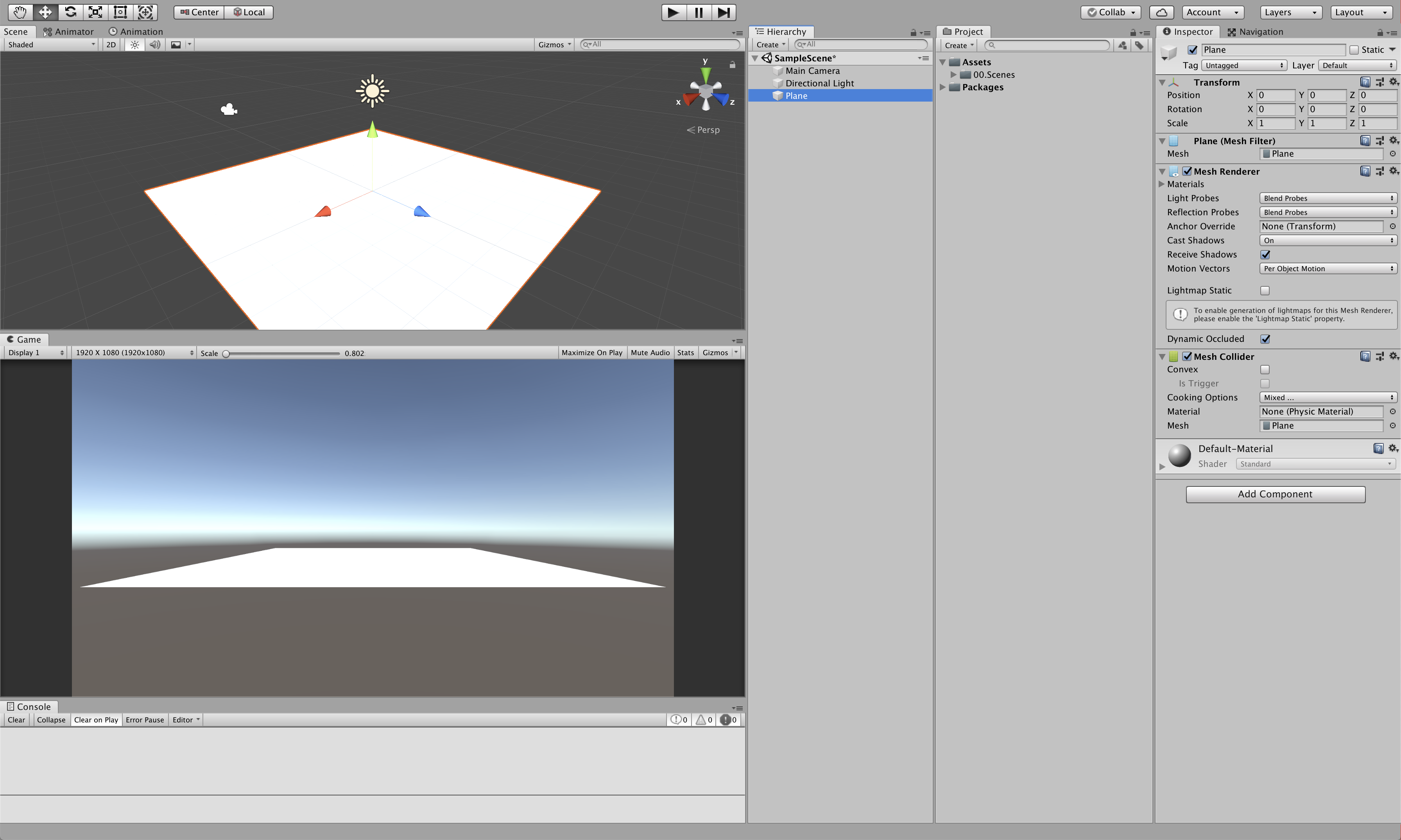 Hierarchy 창에서 Create > 3D object > Plane 선택 Plane의 Transform은 (0, 0, 0)으로 초기화해준다. Main Camera가 (0, 0, 0) 값을 가지고 있기 때문에 Transform이 다른 곳에 있다면 번거로워질 수도 있다.