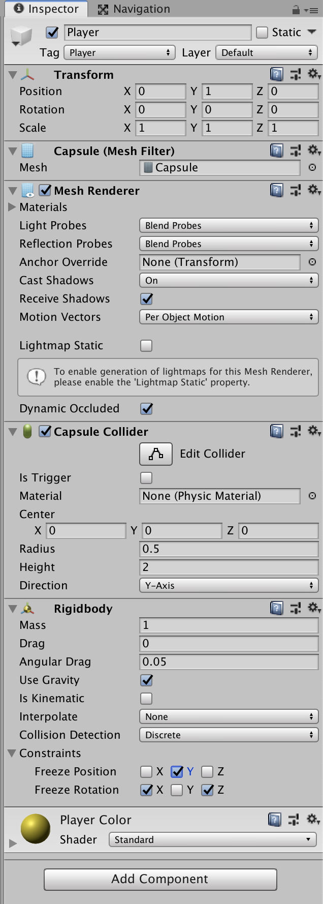 Create > 3D object > Capsule로 생성하고 이름을 알아보기 쉽게 Player로 지정한다. (아까 만든 Cube도 이름을 Wall로 해주면 좋다) Position(0, 1, 0)으로 하면 Plane 위에 서 있게 된다. Plane Color와 동일하게 Player Color를 생성하고 Player에 넣어주었다.