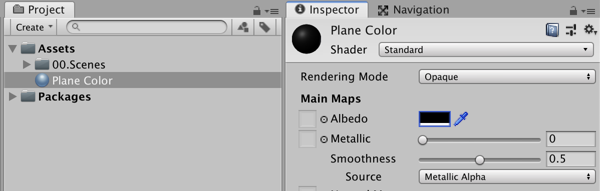 Project 창에서 Create > Material 선택하고 Albedo로 물체의 기본색을 결정한다. Plane Color를 드래그해서 Scene창의 Plane에 넣어주면 색이 Plane Color로 바뀐다.
