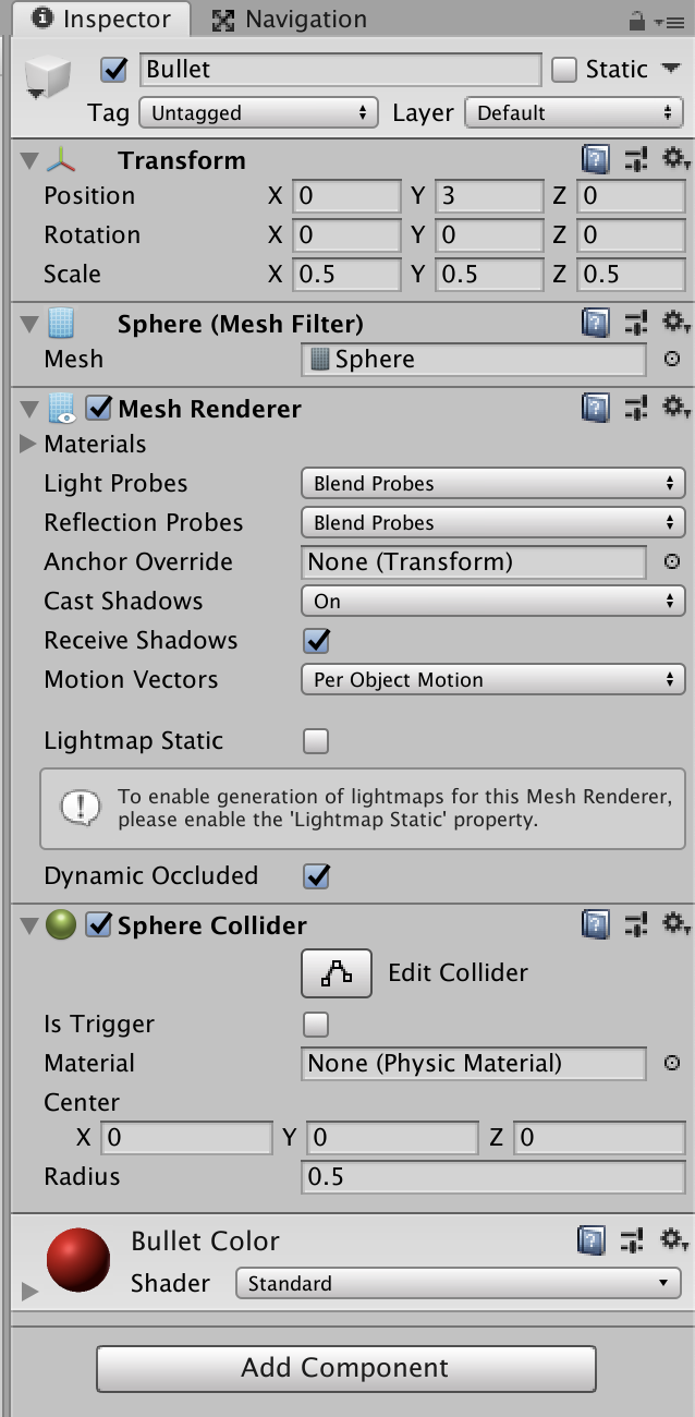 Sphere Collider Component는 Bullet의 충돌을 감지해서 다른 Object의 표면에서 튕겨나가거나 지나가지 못하는 등의 행위가 가능하게 해 준다.