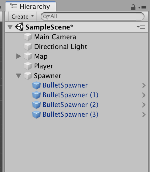 Bullet Spawner를 Prefab으로 둔 걸 드래그해서 Hierarchy창에서 사용하는 모습이다.