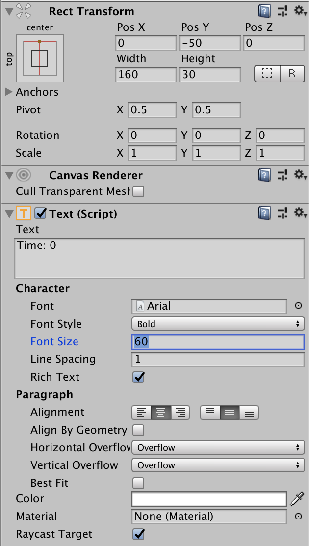 Font 내용을 Time: 0로 변경하고 Alignment를 모두 Center정렬로 설정한다. Font Size는 60, Style은 Bold로 설정했다.