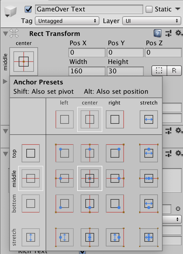 현재 생성된 Text이름을 'Time Counter'로 변경했다. 그리고 Anchor Presets를 누르고 Option(⌥)키를 누르면 모양이 바뀌는데 그 때 top - center 부분을 눌러주면 된다.