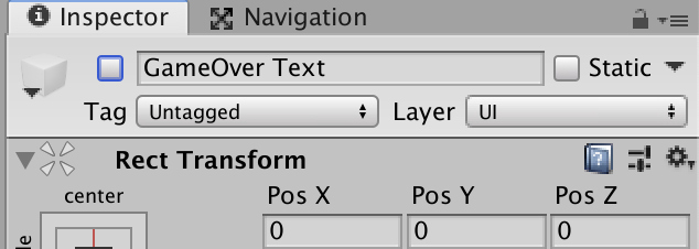 GameOver Text 이름창 옆에 선택 버튼이 선택되어 있는데, 해당 버튼은 해당 Object가 활성화되는지 비활성화되는지를 의미한다.
